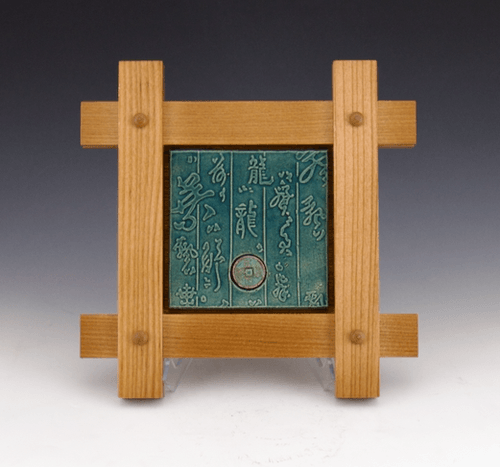 Celadon glazed tile featuring ancient Chinese currency within wood frame.