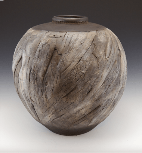 Large-scale wheel-thrown vessel with stamped, etched, expanded, eroded surface with stains, underglaze, and glaze. Multi-fired. 22" High x 20" wide