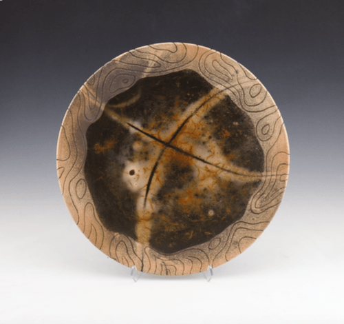 Wheel-thrown, burnished, etched, and saggar-fired wall plate, 12"x12"