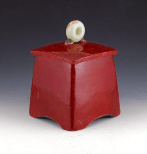 Slab-built, lidded box, raku-fired with polished rock from China.