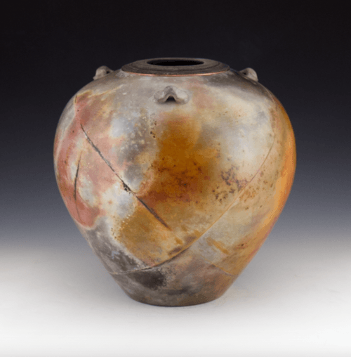 Wheel-thrown, burnished, and pit-fired vessel with handles and copper wire.